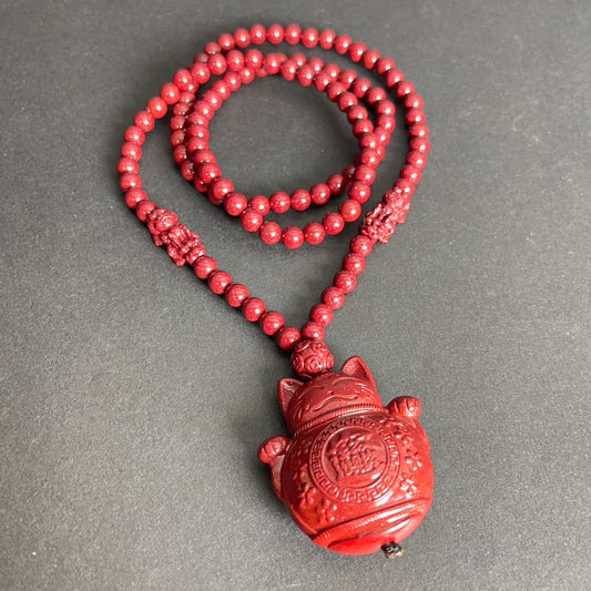 108 Beads Cinnabar Necklace with Maneki Neko Pendant – Spiritual Lucky Charm for Prosperity, Protection & Positive Energy